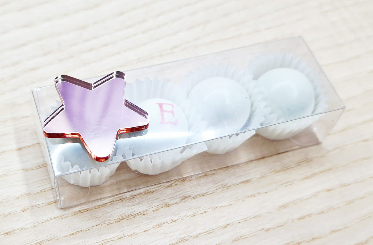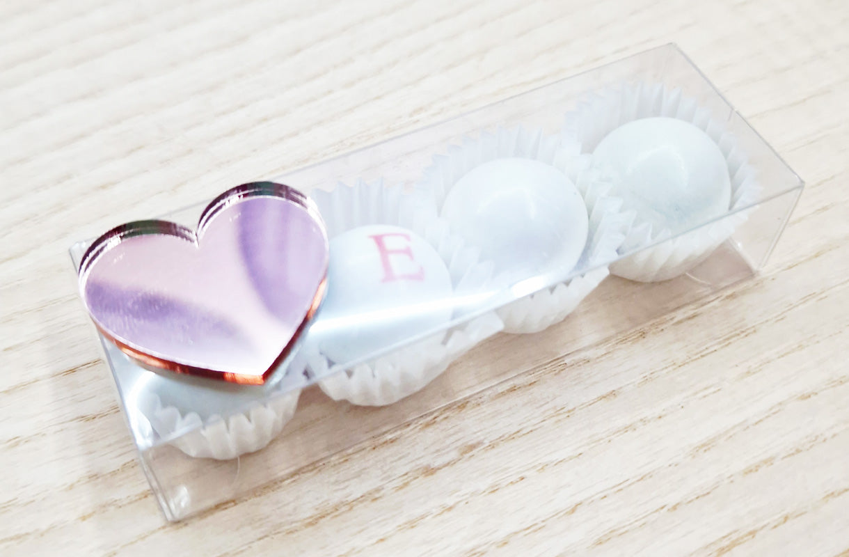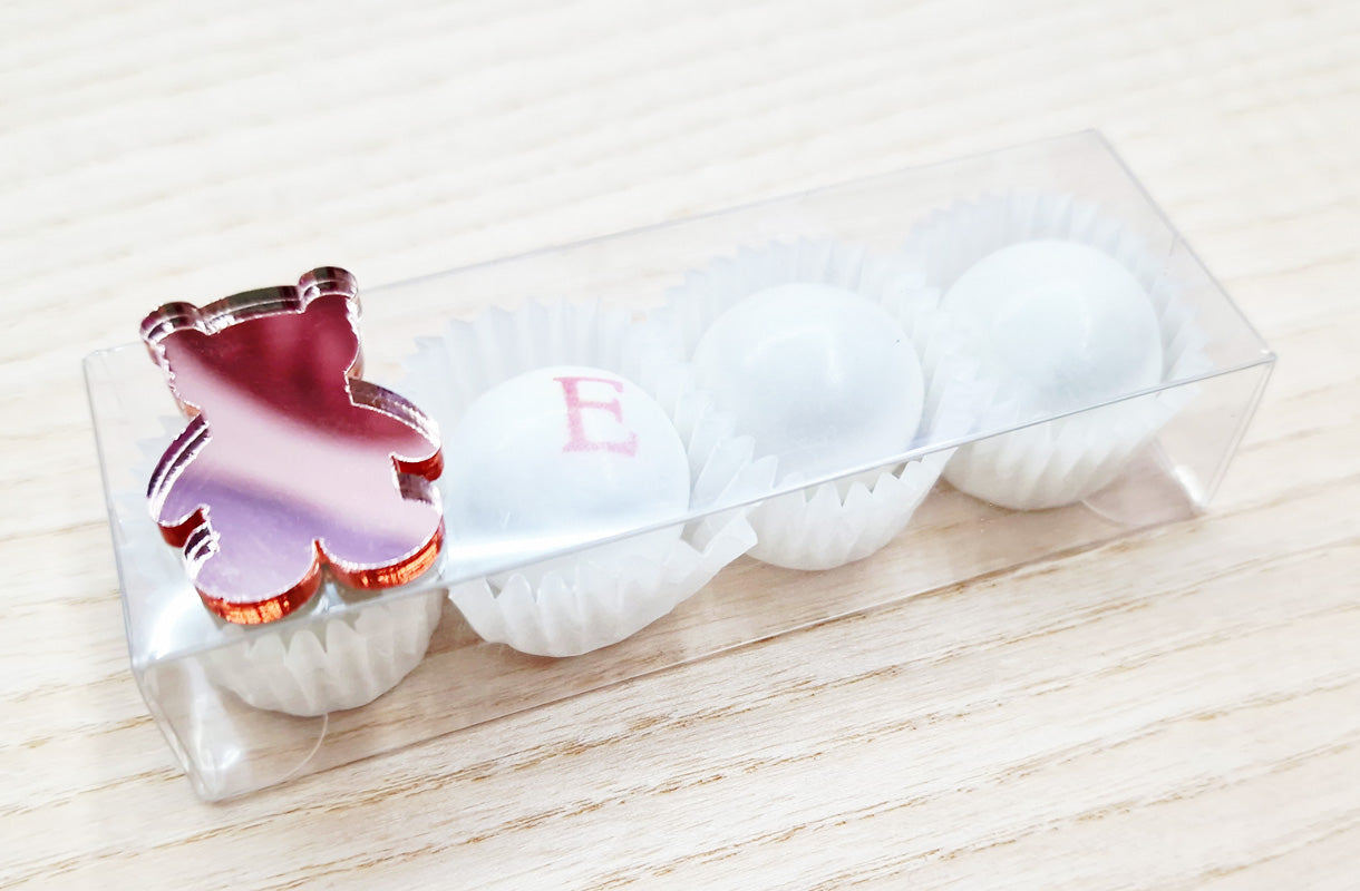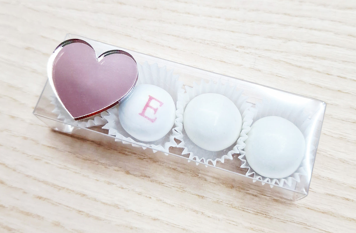 Scatolina trasparente con tag specchio e confetto con iniziale