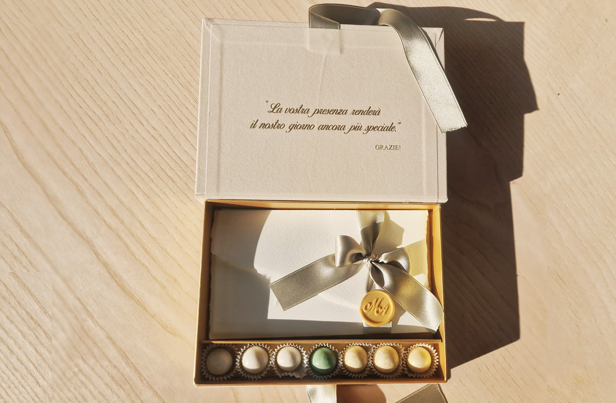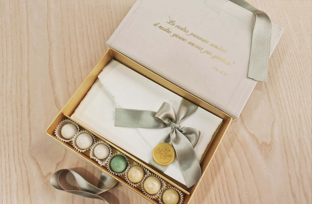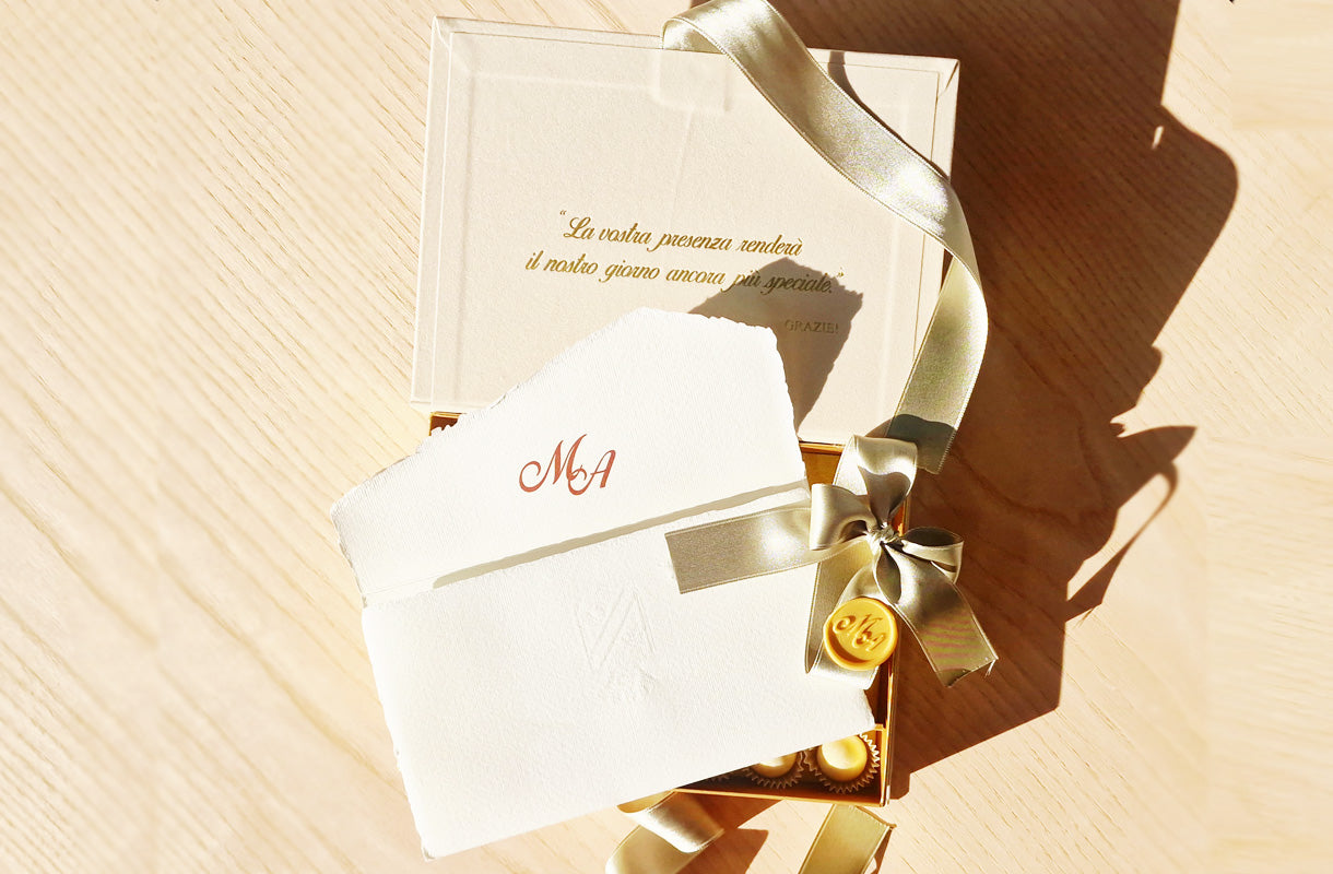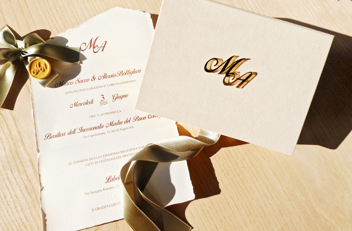 Un invito che profuma di tradizione e raffinatezza. Realizzata in carta Amalfi artigianale, con i caratteristici bordi irregolari rifinita con un elegante nastro in raso e timbro in ceralacca personalizzato con il logo degli sposi è alloggiata in una scatola di velluto con frase stampata a caldo in oro , il tutto addolcito dai confetti. Questa partecipazione è interamente prodotta a mano in Italia. Ogni dettaglio racconta la cura e la passione dell’artigianato d’autore, per annunciare il vostro giorno speciale con eleganza e autenticità.