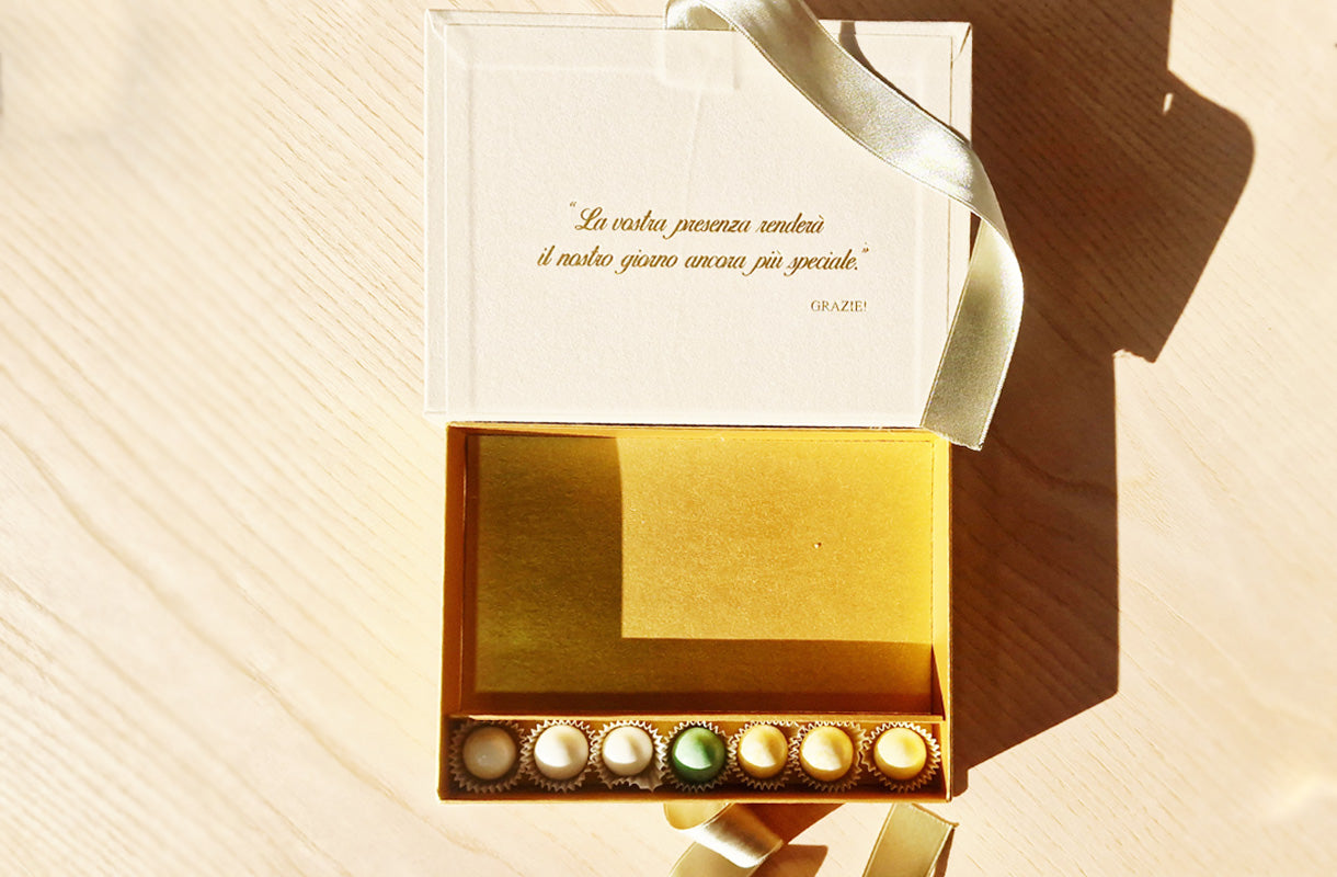 Caratteristiche scatola: Velluto panna, nastro raso verde salvia, stampa a caldo interno scatola, tag sposi in plxiglass specchio esternamente.