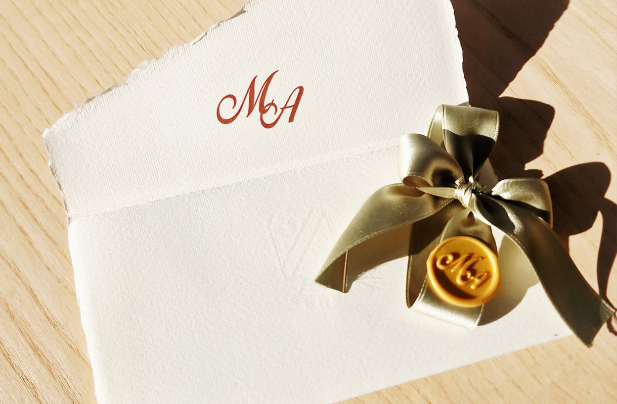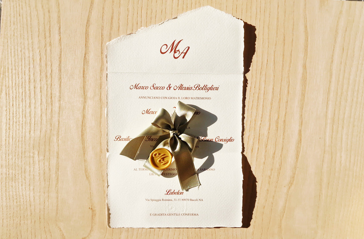 Un invito che profuma di tradizione e raffinatezza. Realizzata in carta Amalfi artigianale, con i caratteristici bordi irregolari e la texture vellutata, rifinita con un elegante nastro in raso e timbro in ceralacca personalizzato con il logo degli sposi. Questa partecipazione è interamente prodotta a mano in Italia. Ogni dettaglio racconta la cura e la passione dell’artigianato d’autore, per annunciare il vostro giorno speciale con eleganza e autenticità.