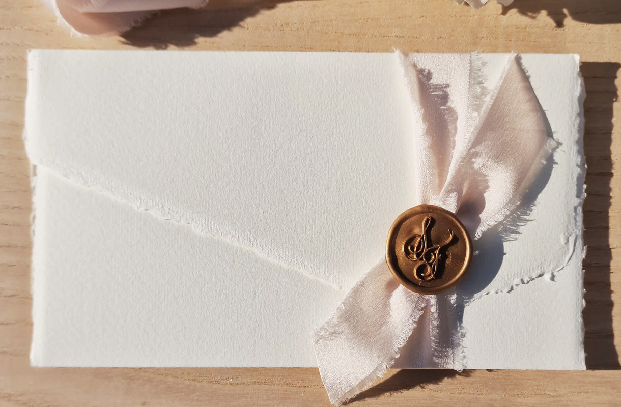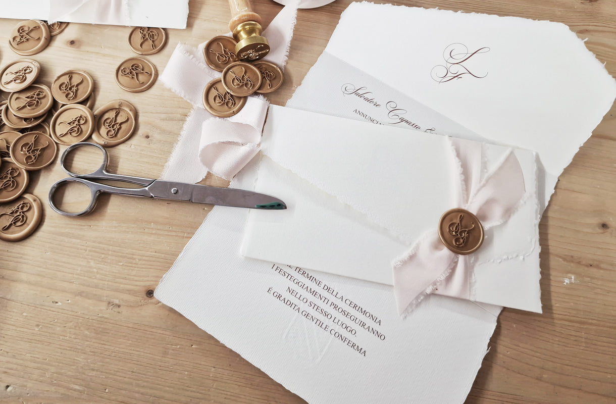 Un invito che profuma di tradizione e raffinatezza. Realizzata in carta Amalfi artigianale, con i caratteristici bordi irregolari e la texture vellutata, rifinita con un elegante fiocco in seta e timbro in ceralacca personalizzato con il logo degli sposi. Questa partecipazione è interamente prodotta a mano in Italia. Ogni dettaglio racconta la cura e la passione dell’artigianato d’autore, per annunciare il vostro giorno speciale con eleganza e autenticità.