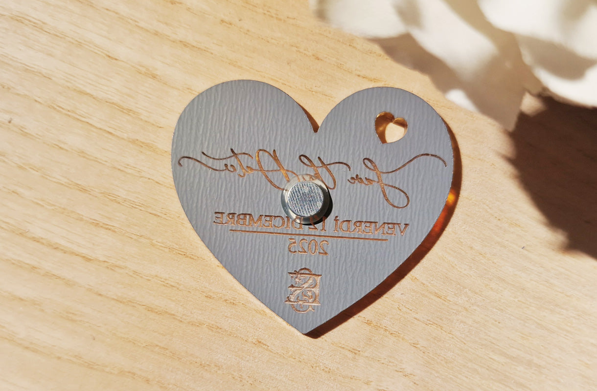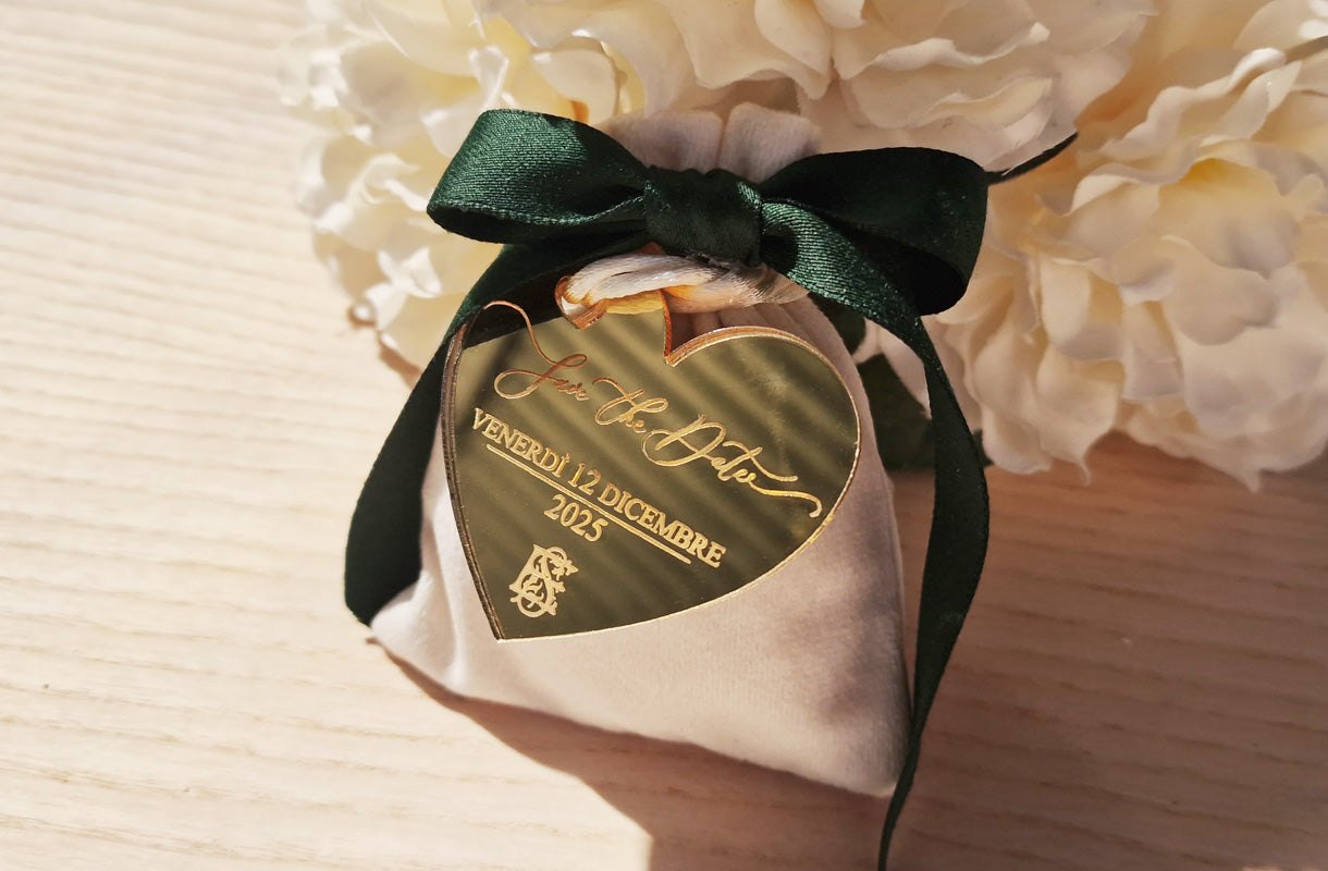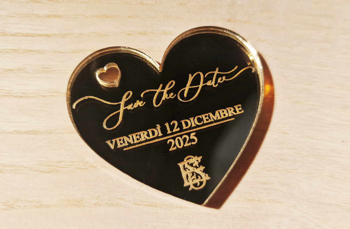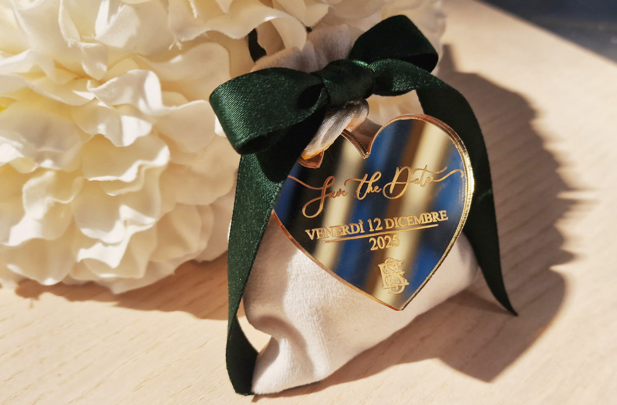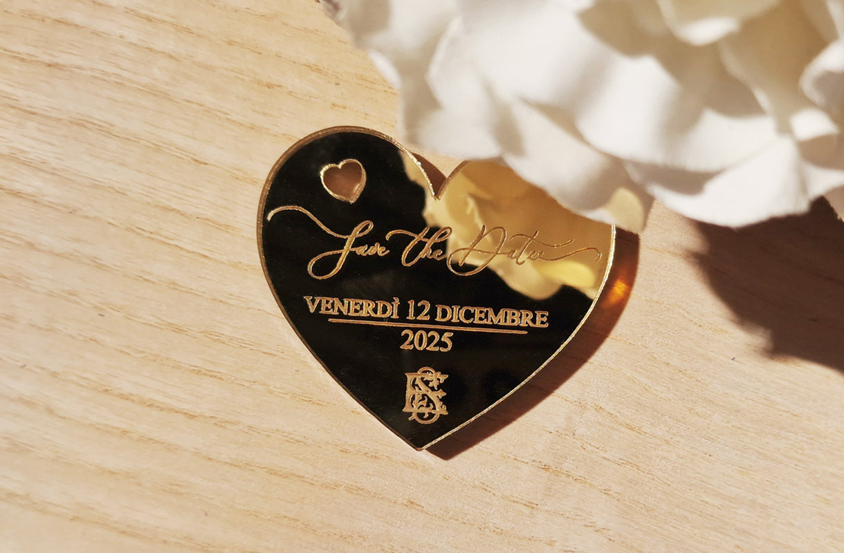 Un piccolo dettaglio che fa subito emozionare: il cuoricino magnetico Save the Date, personalizzato con i vostri nomi e la data del matrimonio.