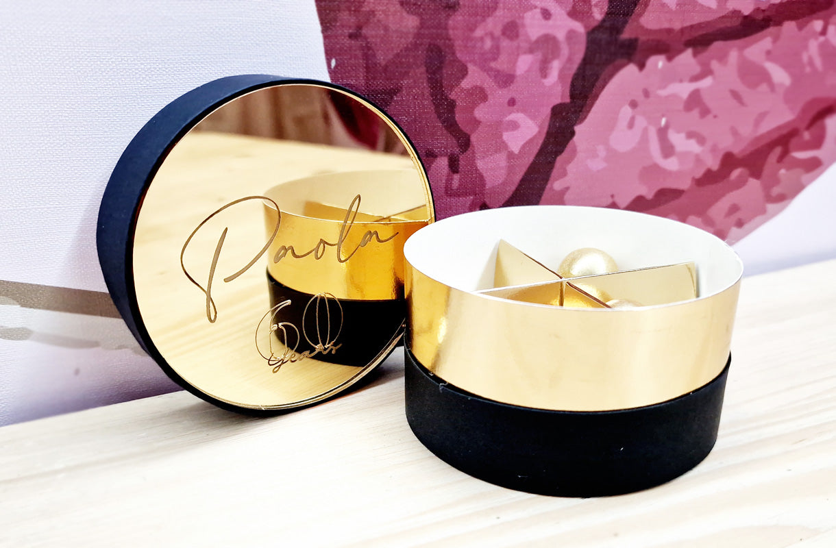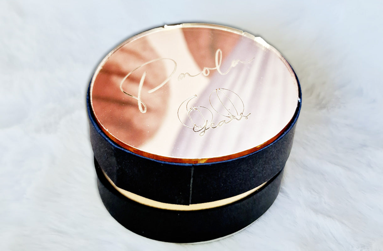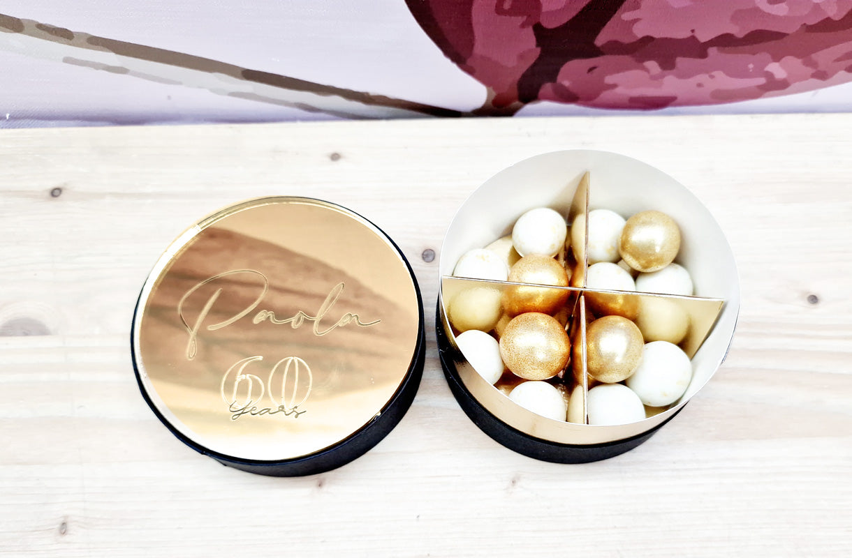 Boîte fleurie bleue au prénom de votre enfant agrémentée d'une plaque miroir en plexiglas. Conçu pour être utilisé comme espace réservé ou comme emballage à afficher lors de la fête des amandes sucrées ou même comme une faveur