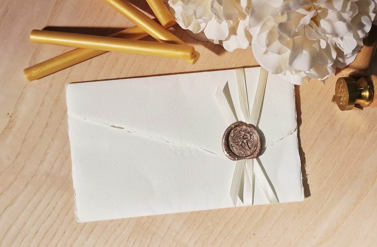 Un invito che profuma di tradizione e raffinatezza. Realizzata in carta Amalfi artigianale, con i caratteristici bordi irregolari e la texture vellutata, rifinita con un elegante nastro in raso e timbro in ceralacca personalizzato con il logo degli sposi. Questa partecipazione è interamente prodotta a mano in Italia. Ogni dettaglio racconta la cura e la passione dell’artigianato d’autore, per annunciare il vostro giorno speciale con eleganza e autenticità.